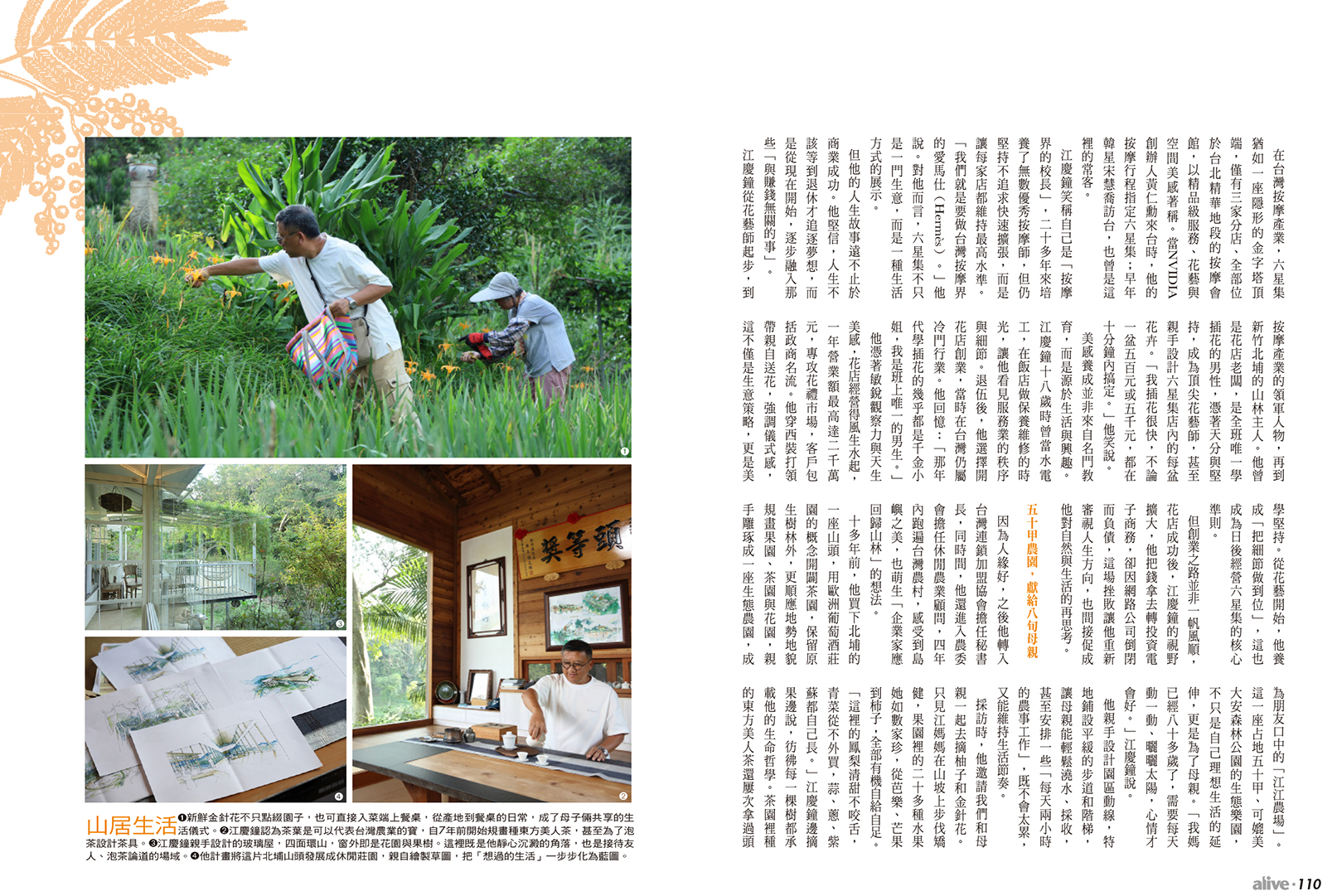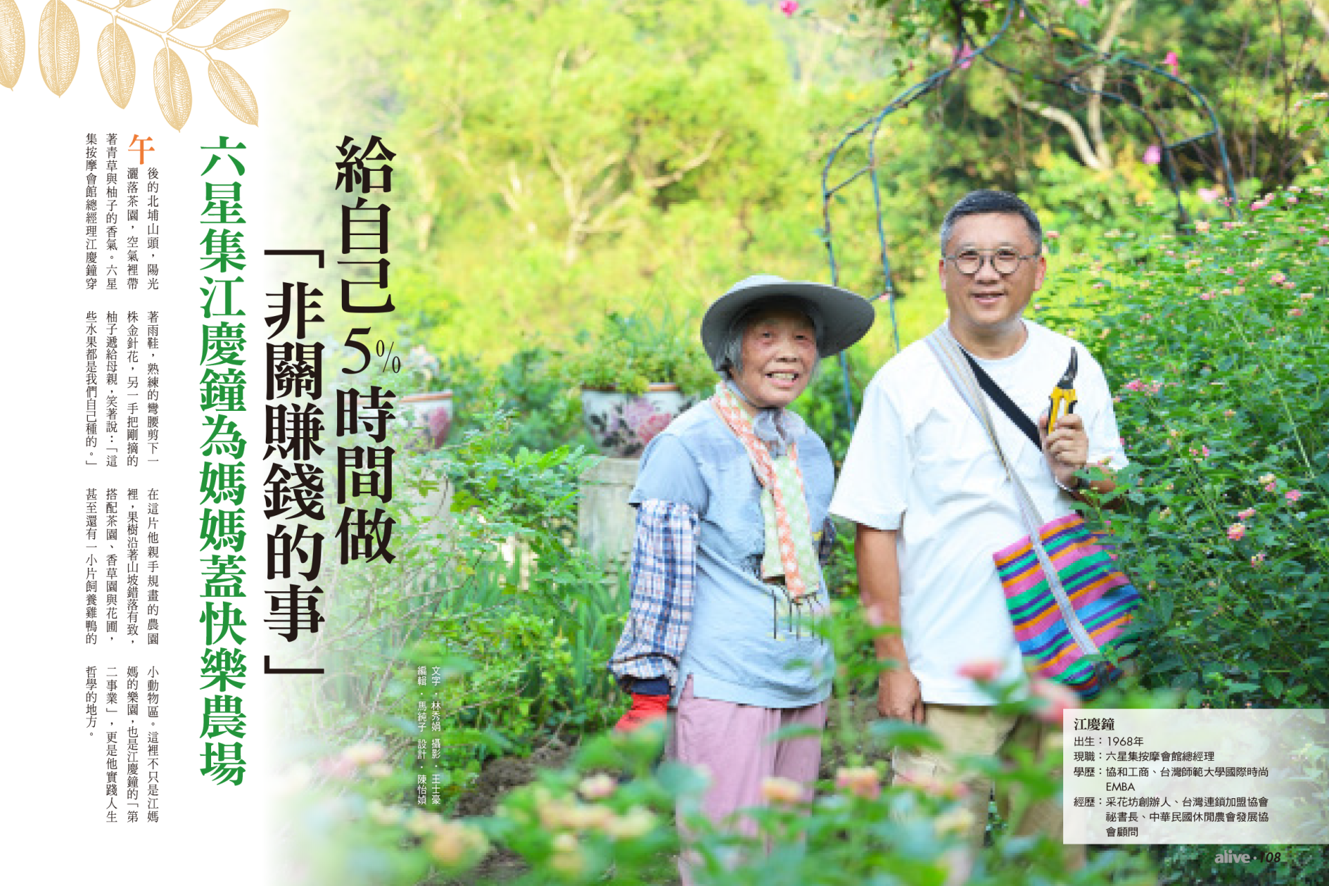 午後的北埔山頭,陽光灑落茶園,空氣裡帶著青草與柚子的香氣。六星集按摩會館總經理江慶鐘穿著雨鞋,熟練的彎腰剪下一株金針花,另一手把剛摘的柚子遞給母親,笑著說:「這些水果都是我們自己種的。」在這片他親手規畫的農園裡,果樹沿著山坡錯落有致,搭配茶園、香草園與花圃,甚至還有一小片飼養雞鴨的小動物區。這裡不只是江媽媽的樂園,也是江慶鐘的「第二事業」,更是他實踐人生哲學的地方。